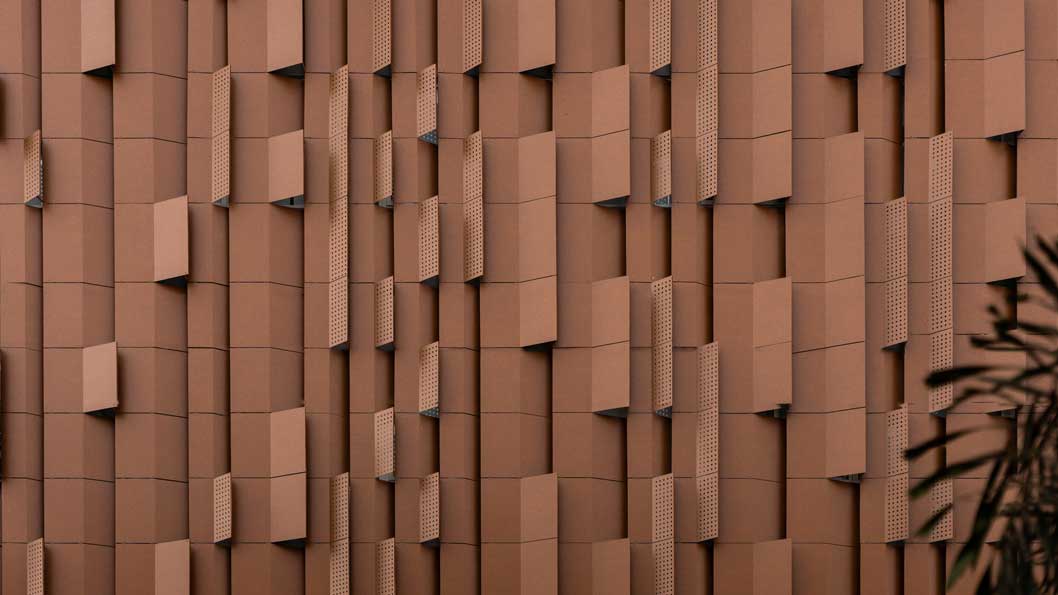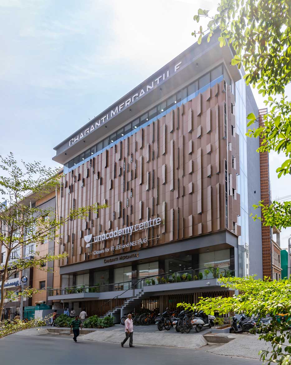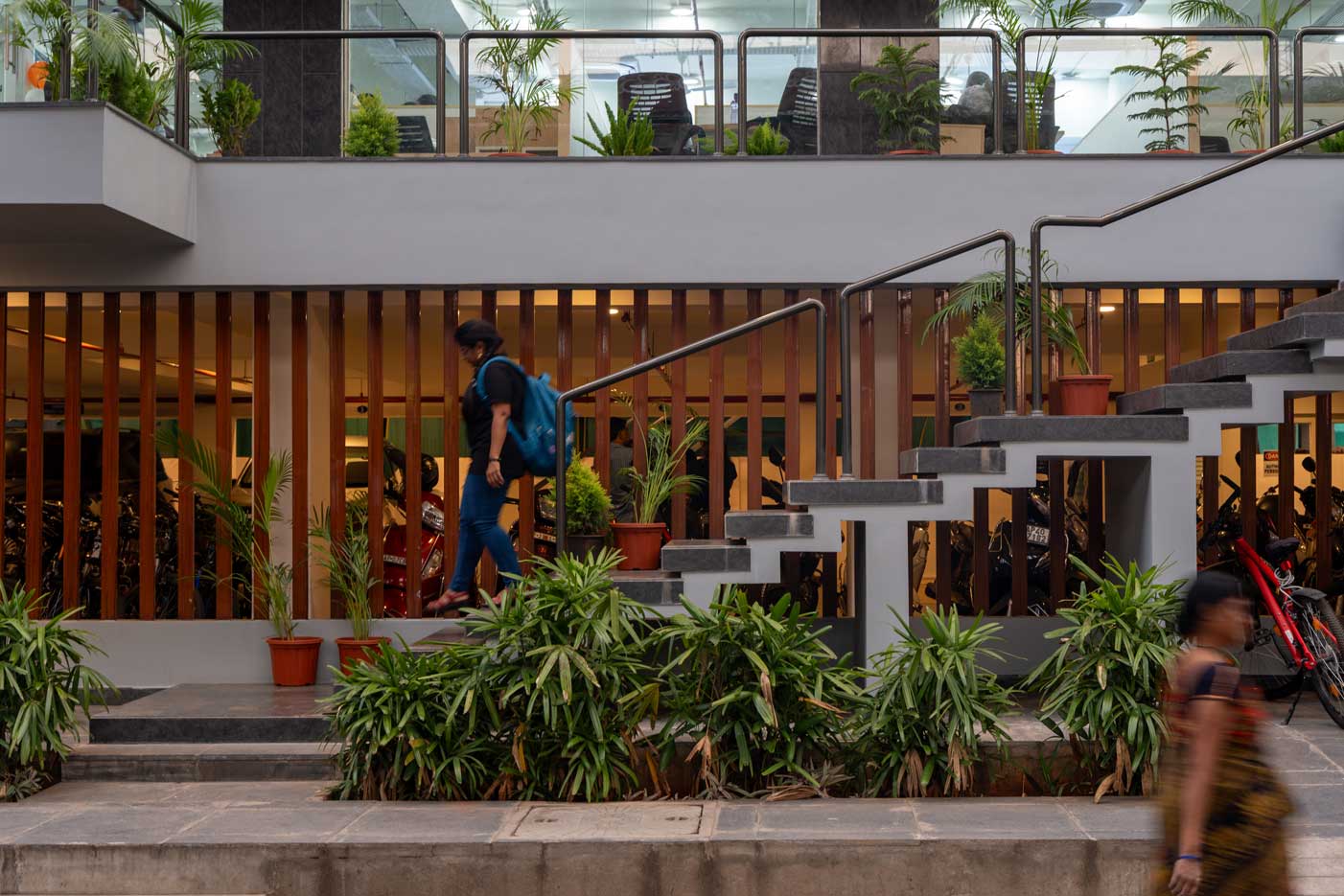 The south face that peeks into a by-lane that connects to the main road is adorned by an imposing clay ‘Jali’ installation that envelopes the internal main stairway running up all 5 floors of the building. This angular wall incorporates an interesting Edan Jali that appeals to the senses externally as well as to those using the stairs.