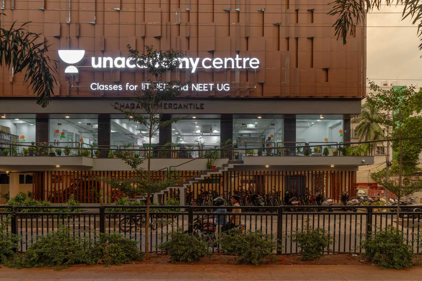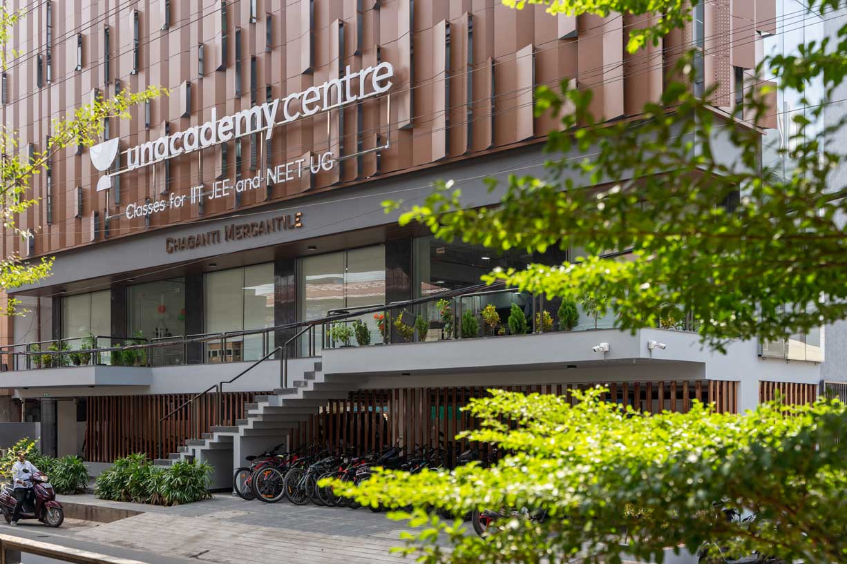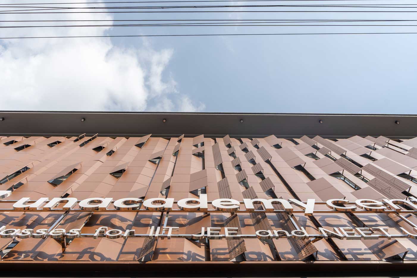 The south face that peeks into a by-lane that connects to the main road is adorned by an imposing clay ‘Jali’ installation that envelopes the internal main stairway running up all 5 floors of the building. This angular wall incorporates an interesting Edan Jali that appeals to the senses externally as well as to those using the stairs.