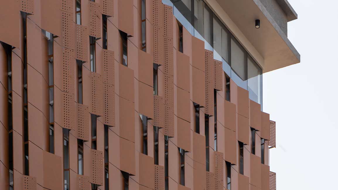 The western façade is adorned with custom angled panels of HPL [mimicking marine steel] forming the outer skin to regulate heat and allow for adequate light.