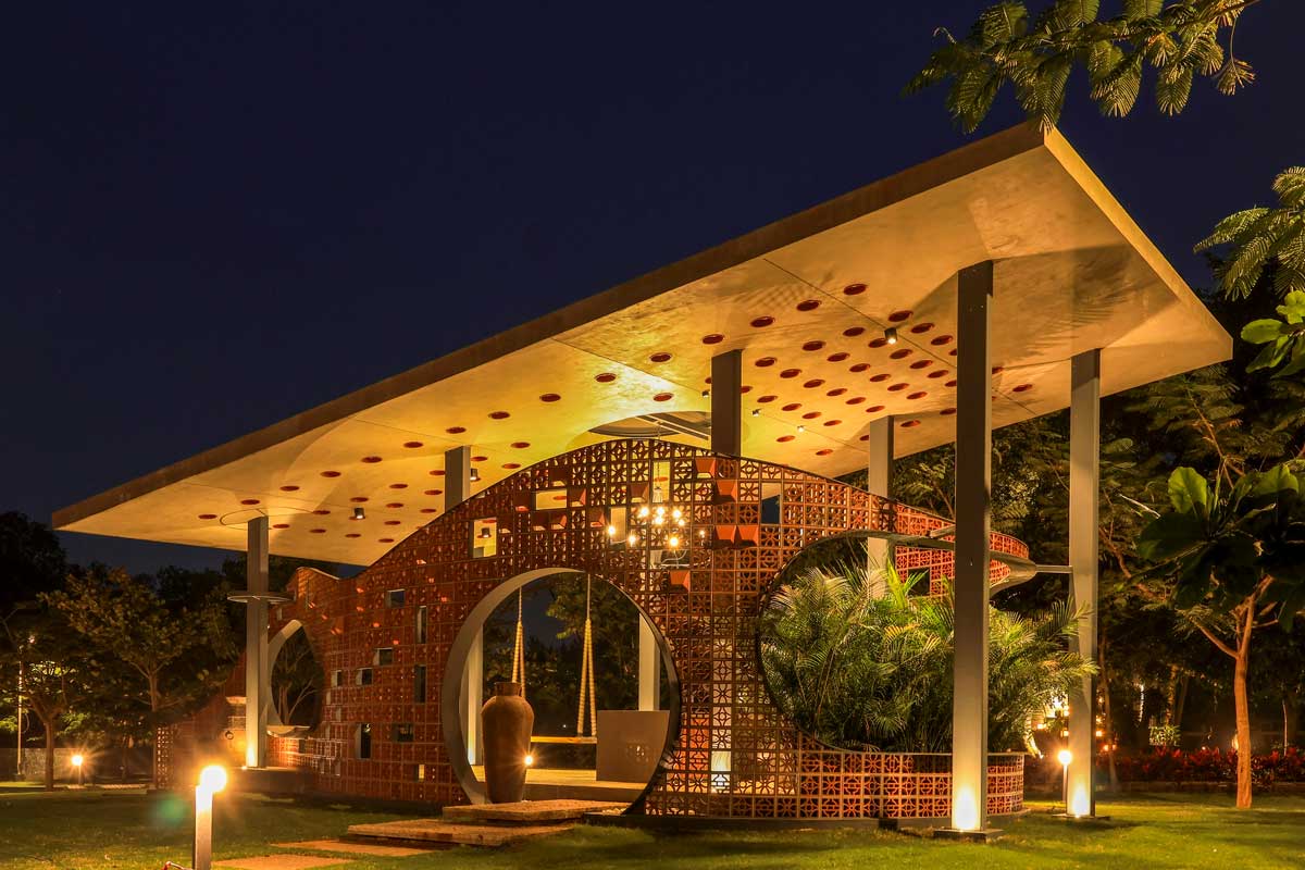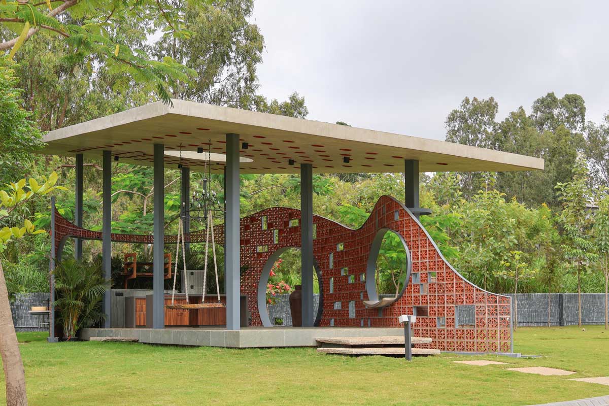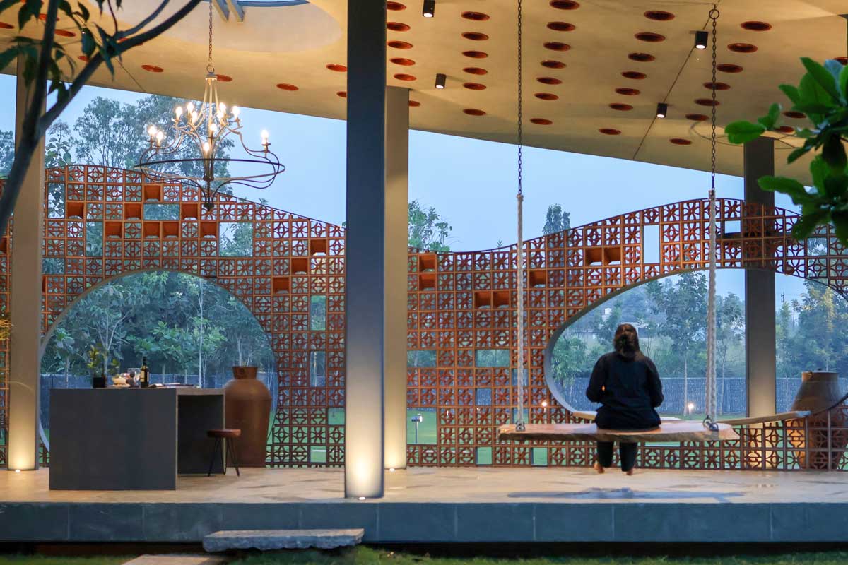 The gazebo’s defining feature is its free flowing ‘jaali’ wall made of natural clay, allowing sunlight to filter through, while maintaining a sense of privacy. This clay jaali wall not only serves as a testament to sustainability but also imparts a warm, earthy tone to the structure. The use of Kota flooring known for its durability and natural elegance, further reinforces the connection with nature.