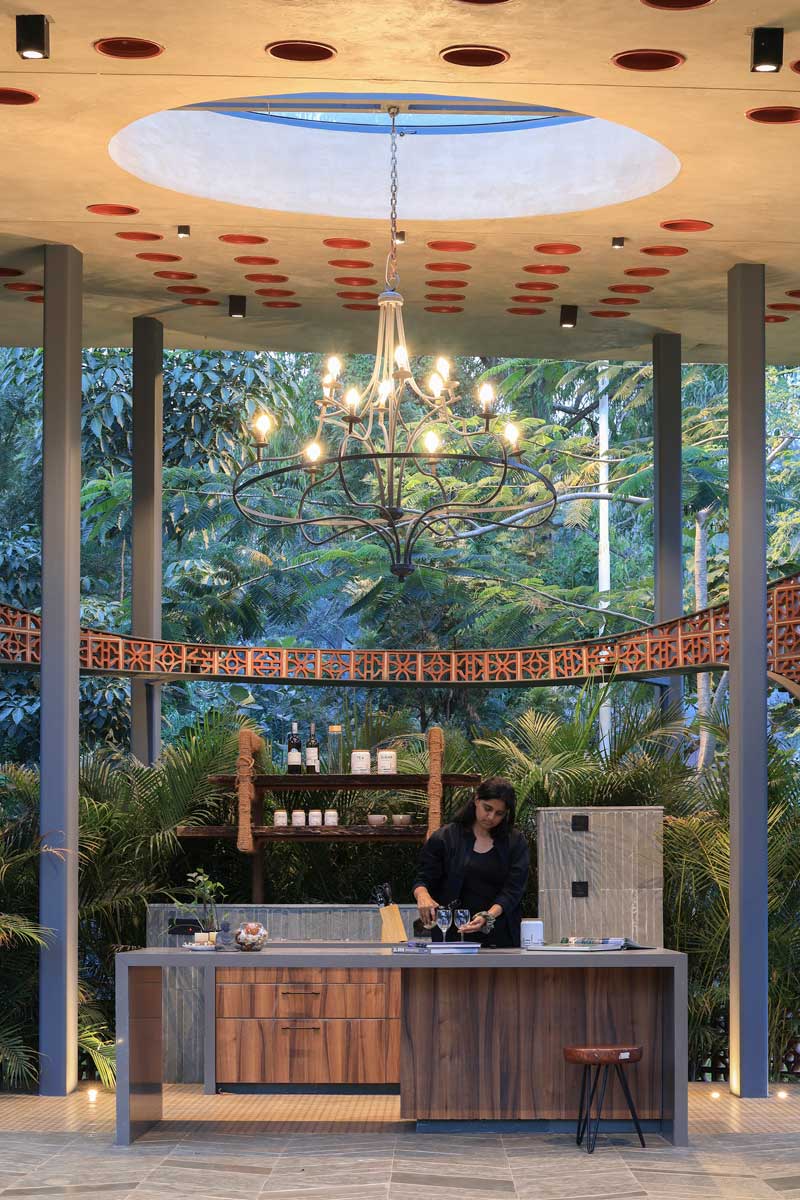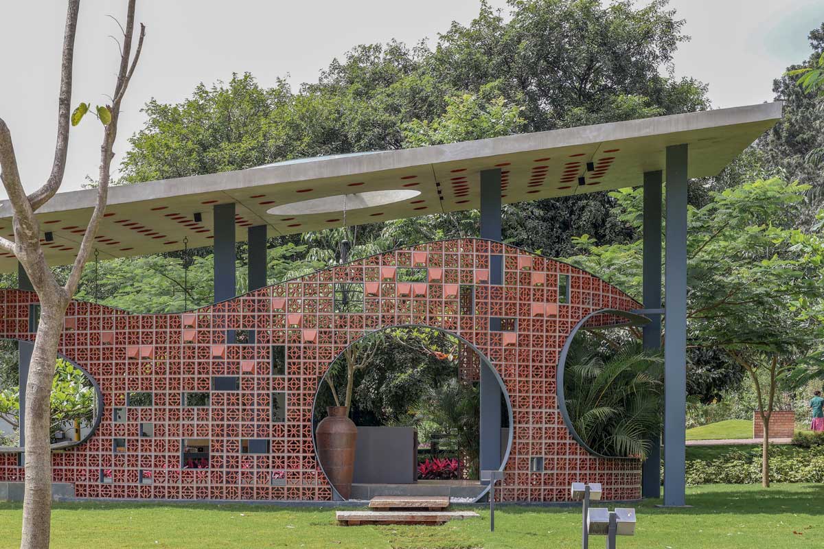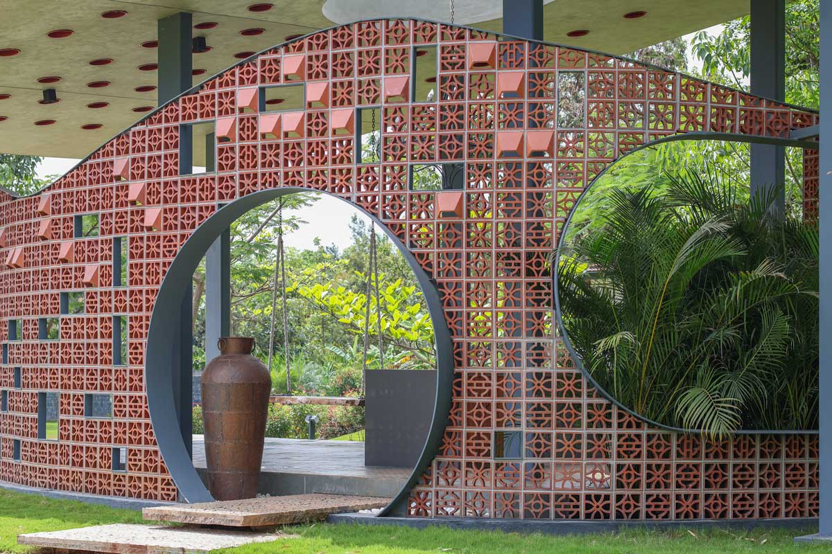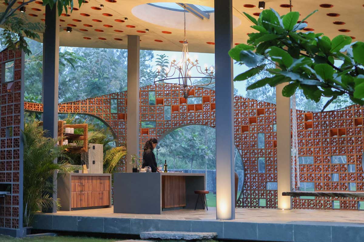 The gazebo’s defining feature is its free flowing ‘jaali’ wall made of natural clay, allowing sunlight to filter through, while maintaining a sense of privacy. This clay jaali wall not only serves as a testament to sustainability but also imparts a warm, earthy tone to the structure. The use of Kota flooring known for its durability and natural elegance, further reinforces the connection with nature.