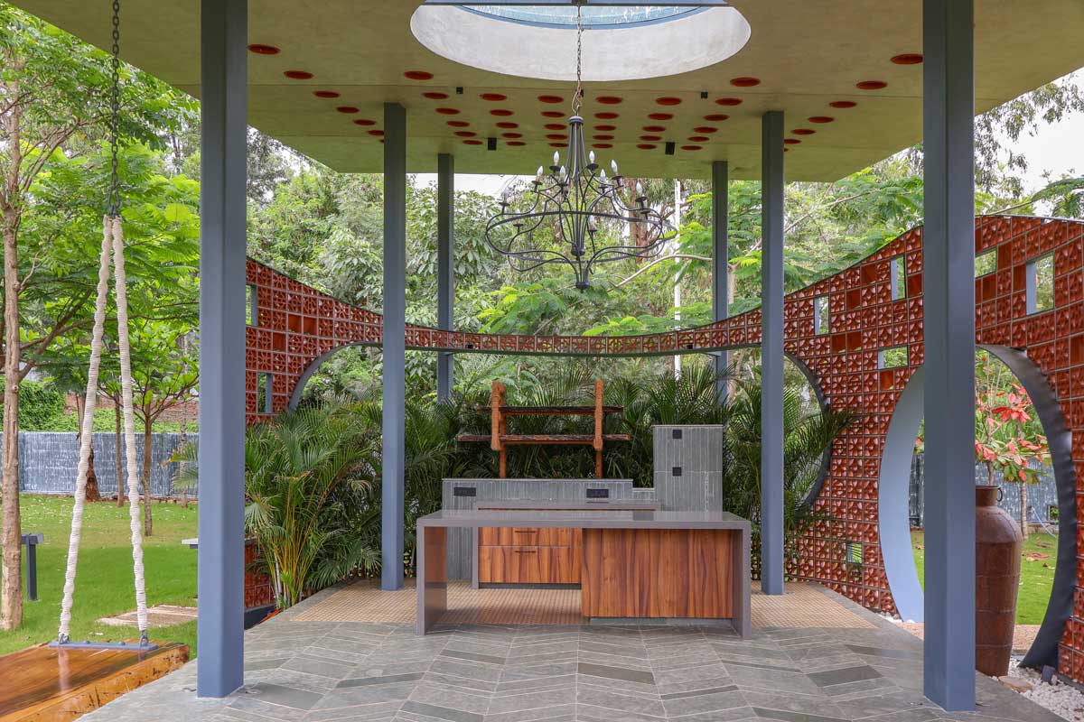 At the heart of the gazebo, a circular skylight cutout bathes the centre island in natural light, emphasizing the seamless connection between the structure and the sky above. A wrought iron chandelier descends gracefully from this centre, casting a warm and inviting glow over the island during the evening hours, transforming the gazebo into a magical heaven.